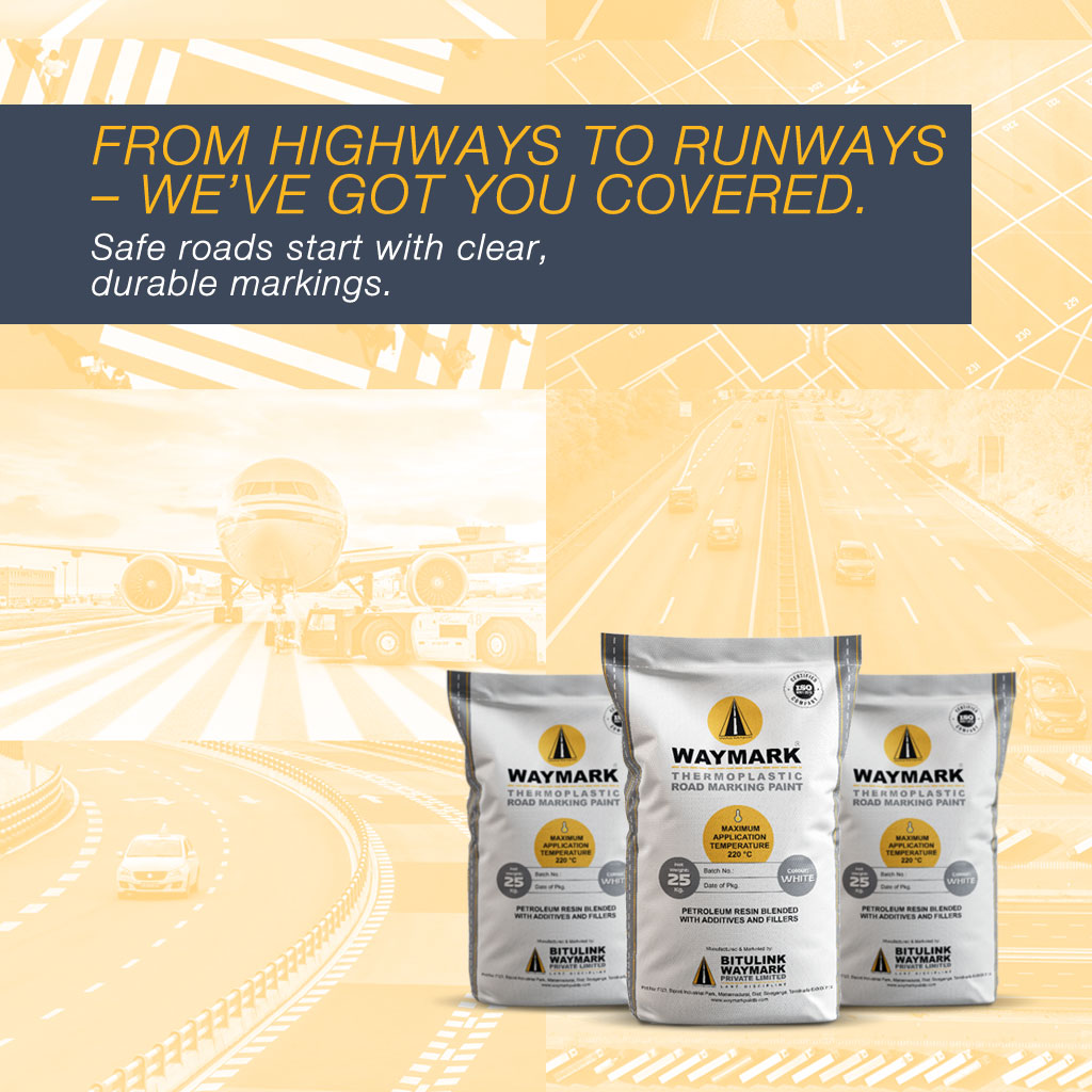 Roads marked with poor-quality paint pose significant safety risks, leading to confusion, collisions, and traffic congestion. The WAYMARK thermoplastic road marking paint provides the best opaque paint, enhancing road safety, minimising the risk of accidents, and aiding in maintaining traffic discipline and ensuring the safety of pedestrians, and encourages responsible road behaviour.