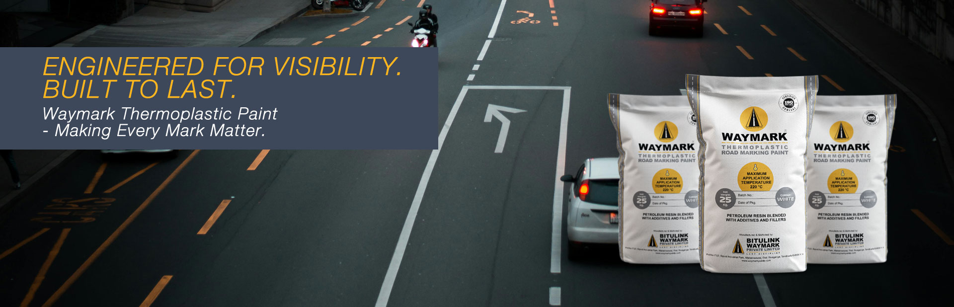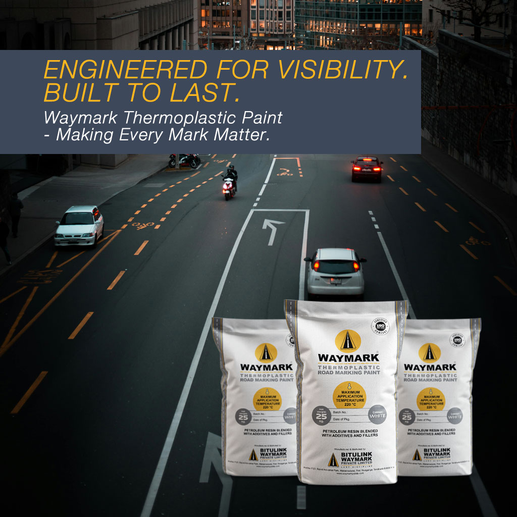 Waymark Thermoplastic Road Marking Paint is a retro-reflective material used for all types of road surfaces. Engineered for long life, high adhesion, and clear visibility, it performs in diverse Indian conditions.